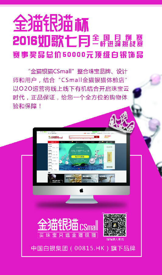 如歌七月全國月例賽、一桿進洞挑戰賽由中國白銀集團冠名贊助,這是如歌首次牽手珠寶企業,共同為廣大球友提供專業賽事平臺和豐厚白銀飾品獎品。